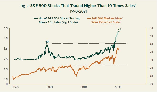 In terms of concentration, a handful of the largest companies represent an unprecedented concentration risk within the richly valued market averages. As with the charts above, such concentration has tended to be a warning sign of a stock market bubble, as shown in Figure 5.